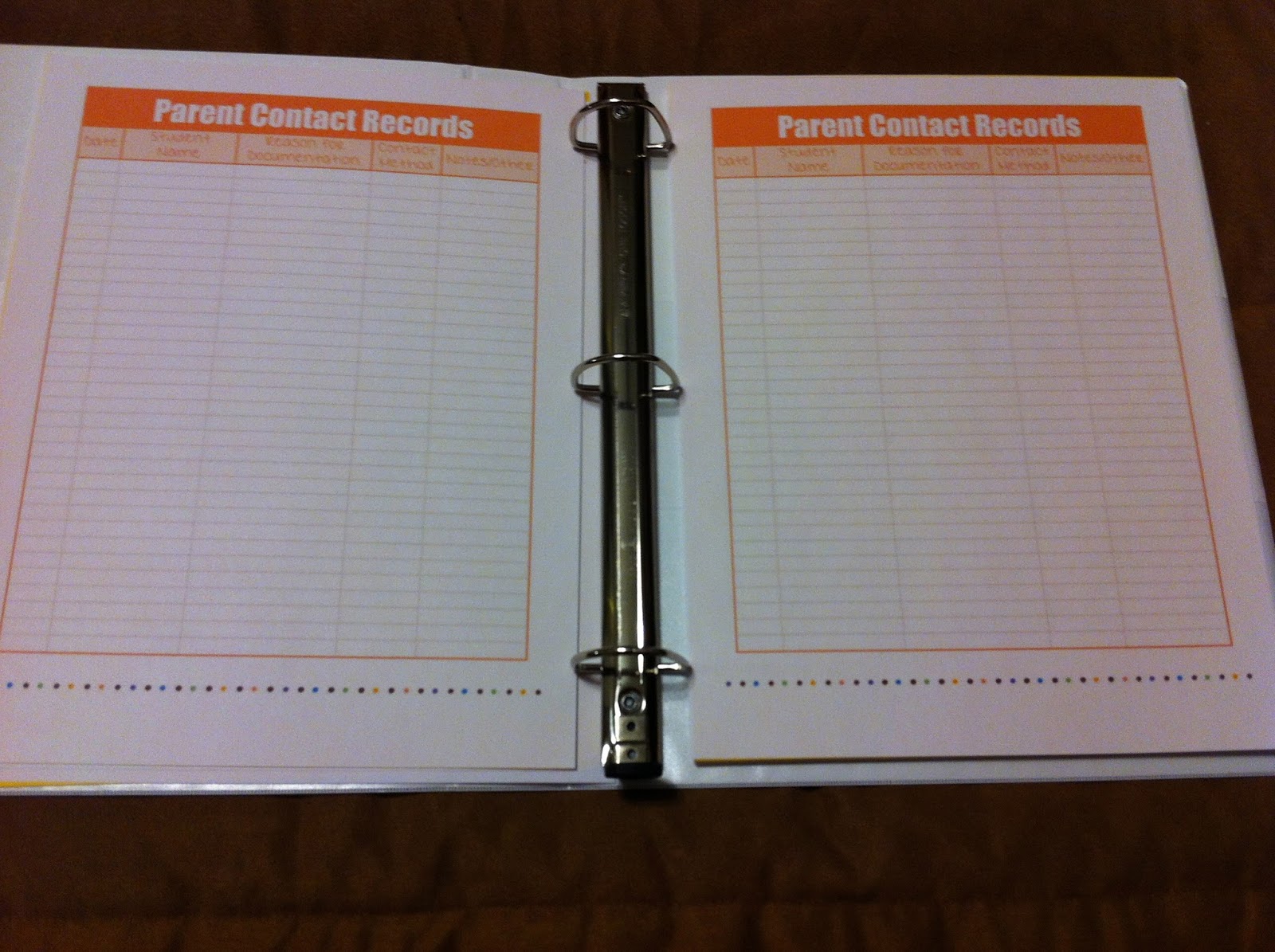 Next will be the divider for Parent Contacts and then the pages (not in clear sheet protectors). I'll make more copies of those as needed.