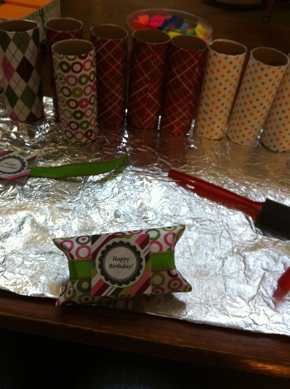 I then wrapped another 19 toilet paper rolls that I've collected since the last time I did this project. I fit the paper a lot easier this time. I realized that I could get four wrappings per piece of scrapbook paper. I modge podged the wrappings on with a sponge brush and let them dry for awhile. I also learned mid-process the last time to lay out some aluminum foil on the table so as to not get any modge podge on the table.