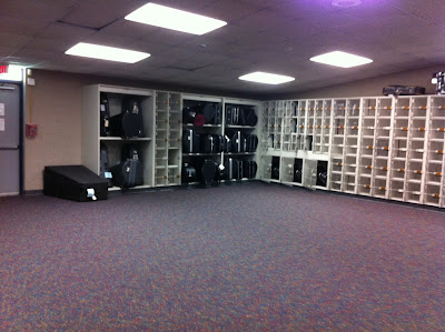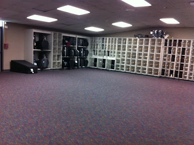 I wish these Wenger lockers weren't so old. There are some doors that have had to be taken off because the hinges broke (and Wenger does not make those hinges anymore). You can see I also took off (well, actually...I had my husband take off) the doors where I keep the euphoniums and tubas. The former director put them on large plastic shelves in the large band room. I think this is the best solution. I do want to purchase tuba stands instead of keeping the tubas in their cases though. They have been getting pretty beat up. This is the one I want to buy: