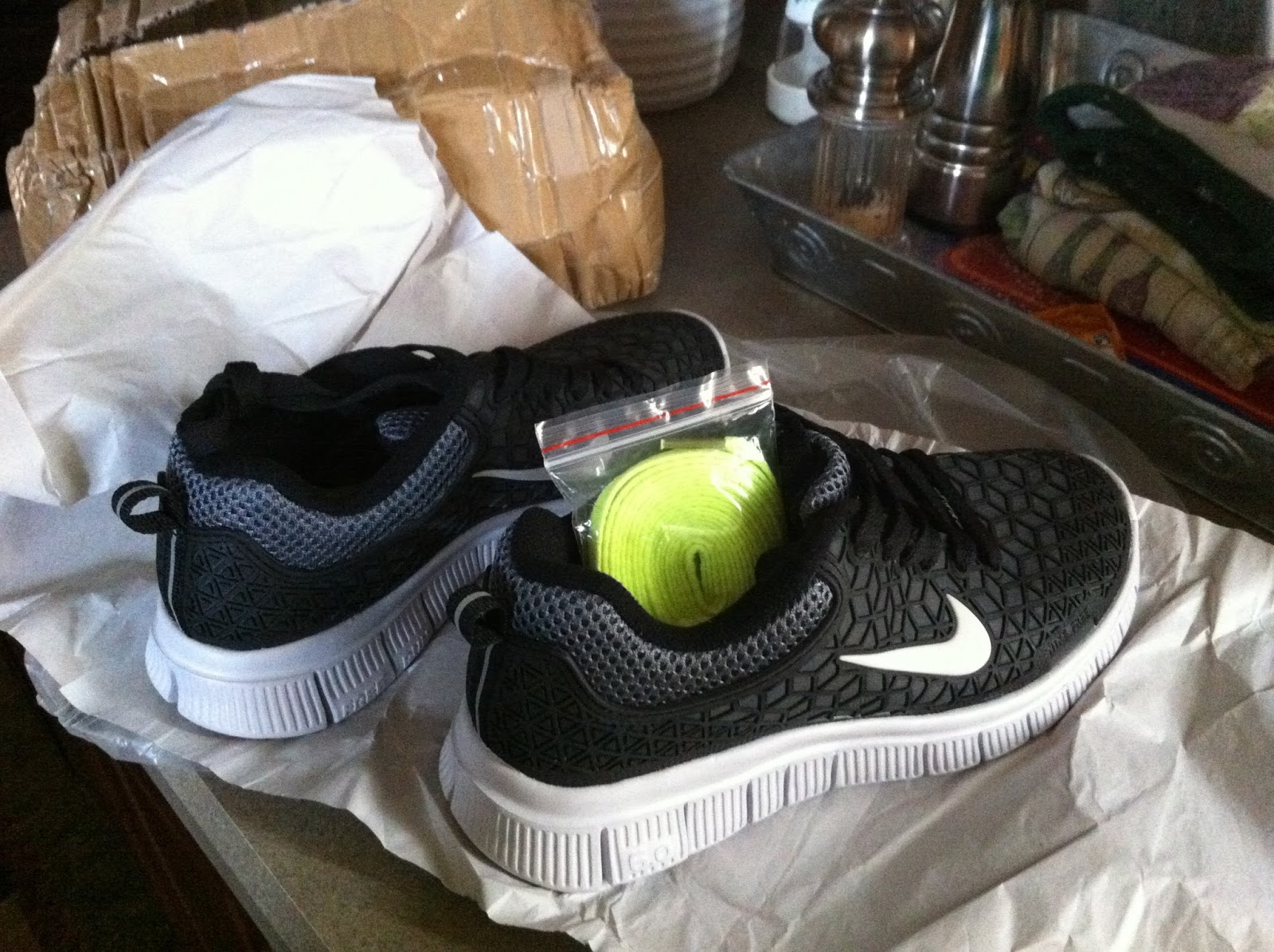 Tomorrow's plan is to get the postcards sent. My husband was so nice to pick them up from Staples for me today while I was on my way home from work. He negotiated a very low price to have them cut too since there were four per sheet (for $2 total to cut all of them!). He also went to the post office today to pick up my Nike shoes that I ordered online for more than 50% off (saw the site to order them on Pinterest) - here is a picture of them: