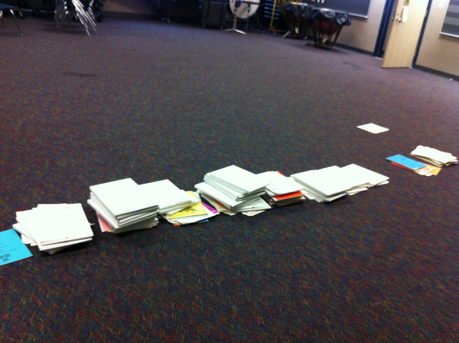 Here are the solo piles (sorry for the blurriness). I had already boxed up all the woodwind, trumpet, horn, and trombone solos before I remembered to take a picture. I brought the rest home to complete in air conditioning (I have baritone, tuba, timpani, mallets, and snare drum solos left).