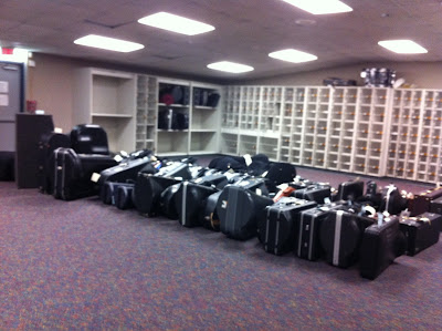 Thankfully the A/C kicked on for about an hour just as we were finishing bringing in the tubas. I left all the repair tags in the cases and put the cases in the assigned lockers (a few years ago I painted locker numbers on the sides of the instrument cases to denote which lockers they were assigned to) and left the locker doors open. I did that so that when the kids come to check out school-owned instruments, they will be able to identify more quickly the instruments that were cleaned/repaired this summer. Here are some shots of the small band room/instrument storage room from different angles: