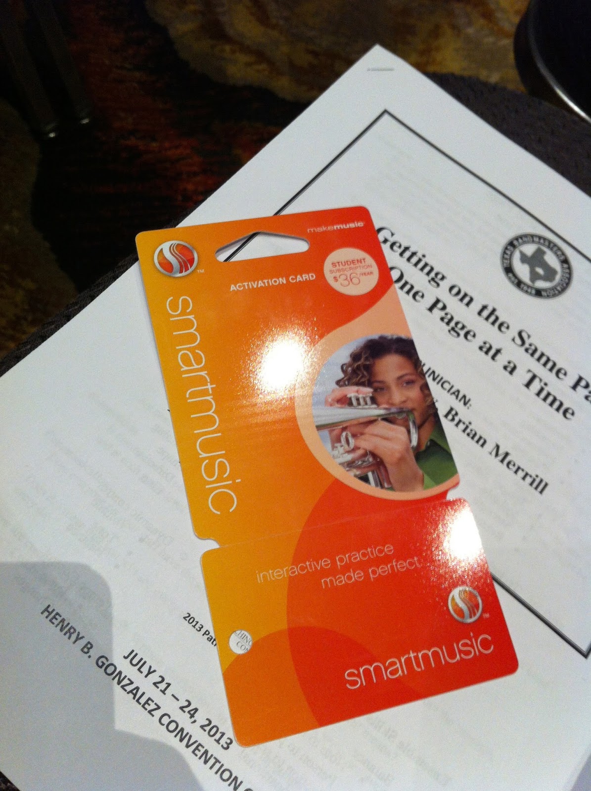 While I was exhibit hall wandering, I stopped at the SmartMusic booth to learn what's new with the iPad app. They mentioned that we could fill out the "I'd like more information" card for a drawing to win one free student subscription. I thought, "What the heck." I will be using SmartMusic for the first time with my band students This year. Well, they didn't draw my name. They drew some guy's name. But! he wasn't there so they redrew... and they called my name! :)