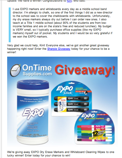 I've been following the On Time Supplies blog and entered a drawing to win free Expo Markers, and I won!! I'm so excited. Here's a screen shot of the email they sent: