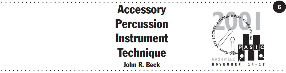 This article by Rich Holly & John R. Beck includes information on Triangle, Tambourine, Bass Drum, Suspended Cymbal, Maracas (and other Shakers), Congas, Claves, Crash Cymbals, Woodblock/Temple Blocks, Castanets, & Sleigh Bells.