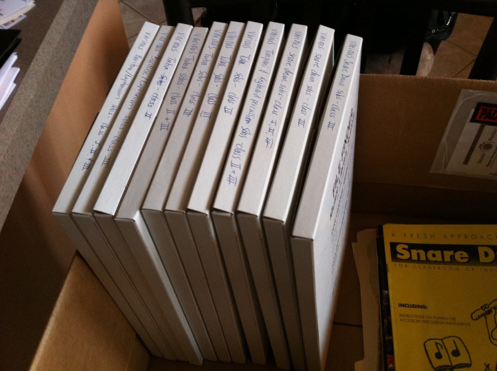 I ran out of the 1" boxes for the concert band music and ordered more from J.W. Pepper. Well, they arrived today, so I should be able to get the rest of the concert band music in boxes and on the shelves. :)