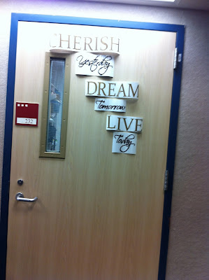 Chris and I realized that the wall decals I bought would probably not stick to the walls because of the stucco (they stick best to smooth walls), so we taped them up on the storage room door in the the back of the band hall to get the layout correct.