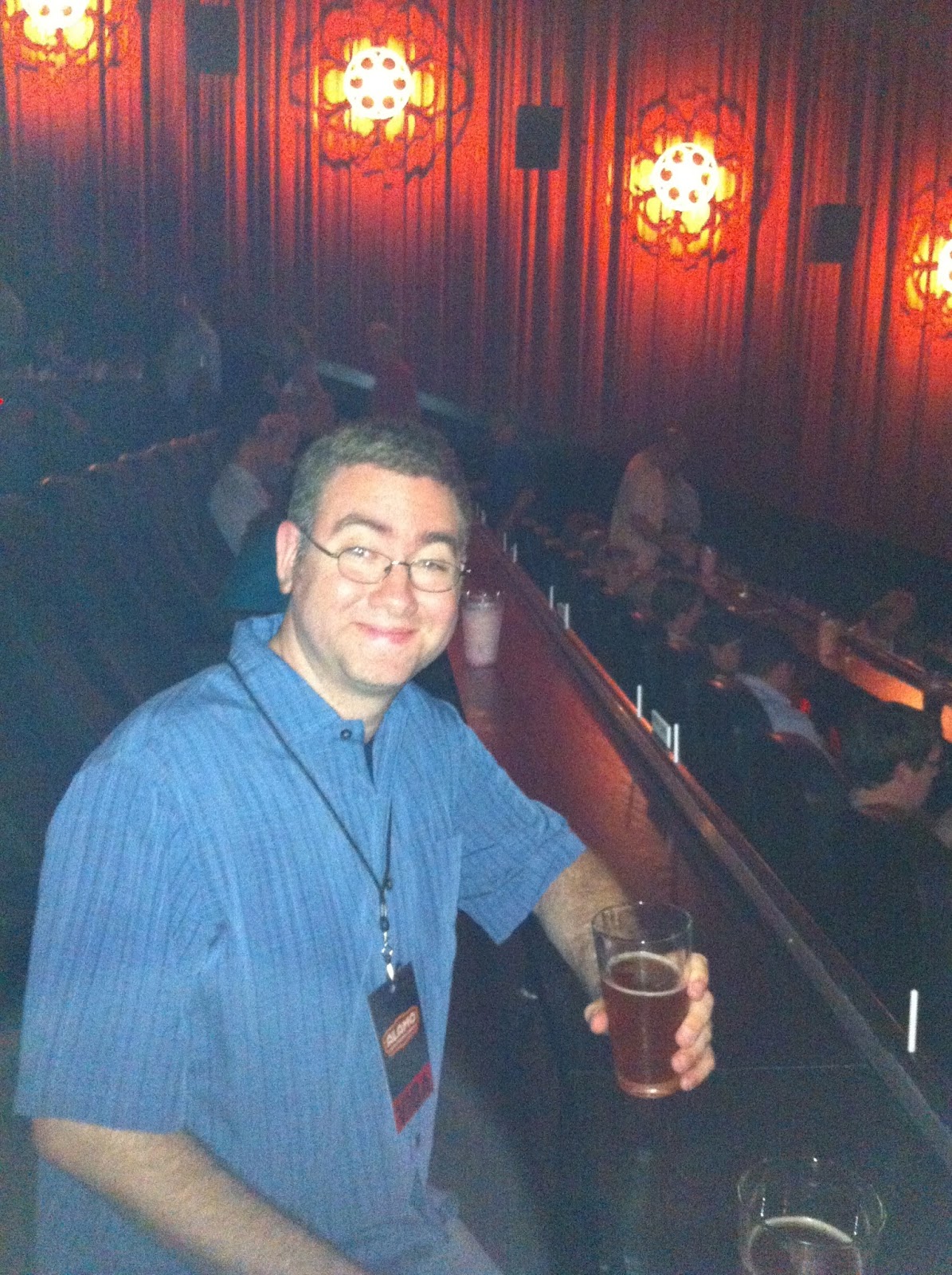 Here's actually a picture of Chris in the second theater during our tour - beer and all. I LOVE the sconces in the theater - they are industrial bulbs in the center of movie reels. I want sconces like these in our media room upstairs. :)