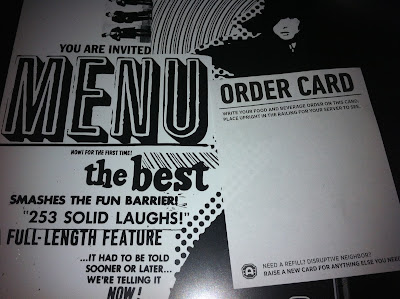 Here's a picture of the menu and order card. You just write your order on the order card and place it standing up on the table thing (no buttons or bright lights to distract others). I will say the one hiccup we experienced was the food. I got the wrong order. They said they'd fix it, but never brought me any food. I also got someone else's milkshake by mistake. They comped us, but I was still hungry. :( Chris let me have one piece of his pizza he ordered. I'm sure they'll work out the kinks when it comes to the food. The movie we watched was SO great though.