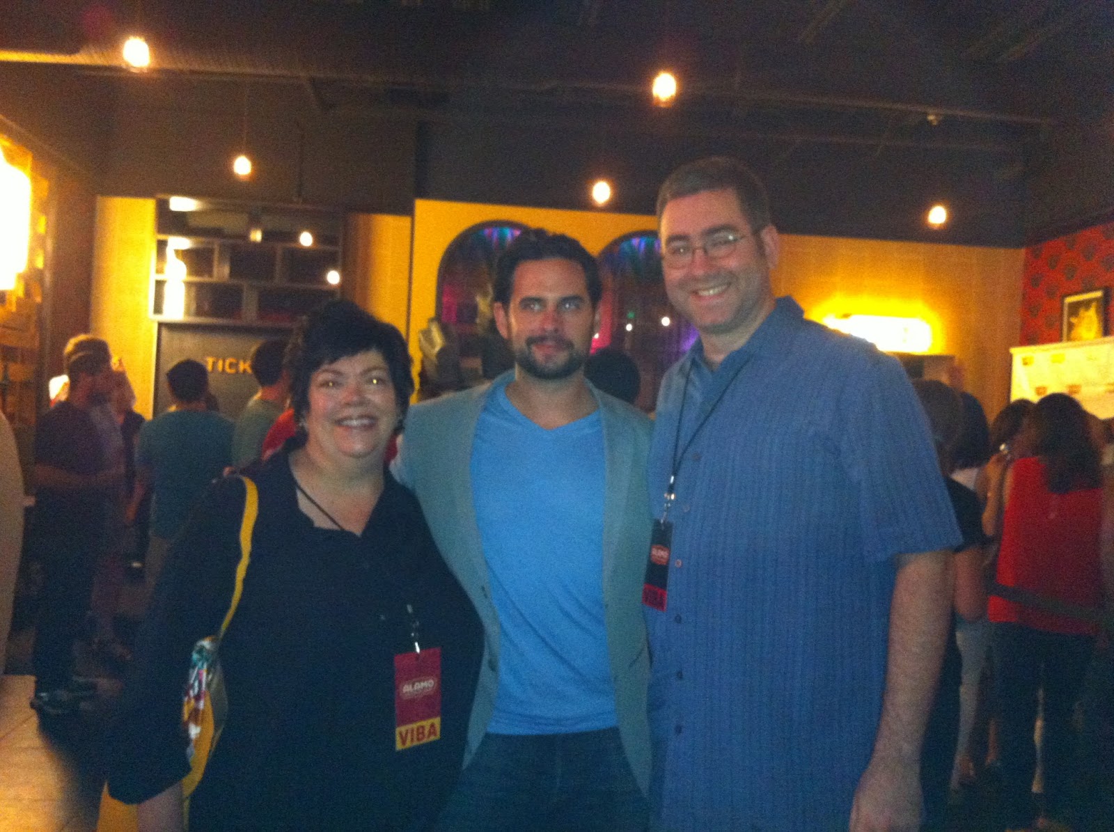 On the tour, we got ushered into different theater rooms for different experiences. We missed the first room which was an interactive theater - the audience members read aloud captions that go with the movie and just take part in the movie experience vocally. Apparently, there was confetti involved too. The second theater (our first) was the largest theater room. We saw a montage that Alamo Drafthouse put together, previews for Elysium and We're the Millers which come out today, information on how to order your food at the Cinema (you can order food and drinks - they have many different local beers on tap), and a PSA put together by Alamo Drafthouse about not having cell phones or talking during the movies. It was pretty funny. It included a recording of an actual disgruntled customer voicemail who got kicked out of an Alamo Drafthouse theater for using her cell phone. Then the owner of Richardson Alamo Drafthouse, Bill DiGaetano, spoke to us all and thanked everyone for their support. The final stop for our group was a slightly smaller theater where we saw some more previews and then the CEO of the Alamo Drafthouse Franchise, Tim League, spoke to everyone and took questions. I really felt like a VIP. All the while, there were employees/ushers, who walked around with trays of different beers and wine for us all to sample. I tasted two beers and one wine. The tour ended around 9 o'clock. Chris & I hadn't eaten dinner, so we decided it would be cool to try out a movie and see what the whole experience was like - and get some food. Chris thought he got us tickets to the 10:00 showing of We're the Millers, but it was for the 10:50 showing since the 10 was sold out. So, we waited around a while and got some more pictures.