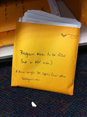 I also semi-sorted the loose music and scores. I was able to put the Marches, Christmas Music, and much of the Popular Music in alphabetical order so that it will be easier to put in the boxes. I put the loose sheet music in envelopes - it looks neater, in my opinion.