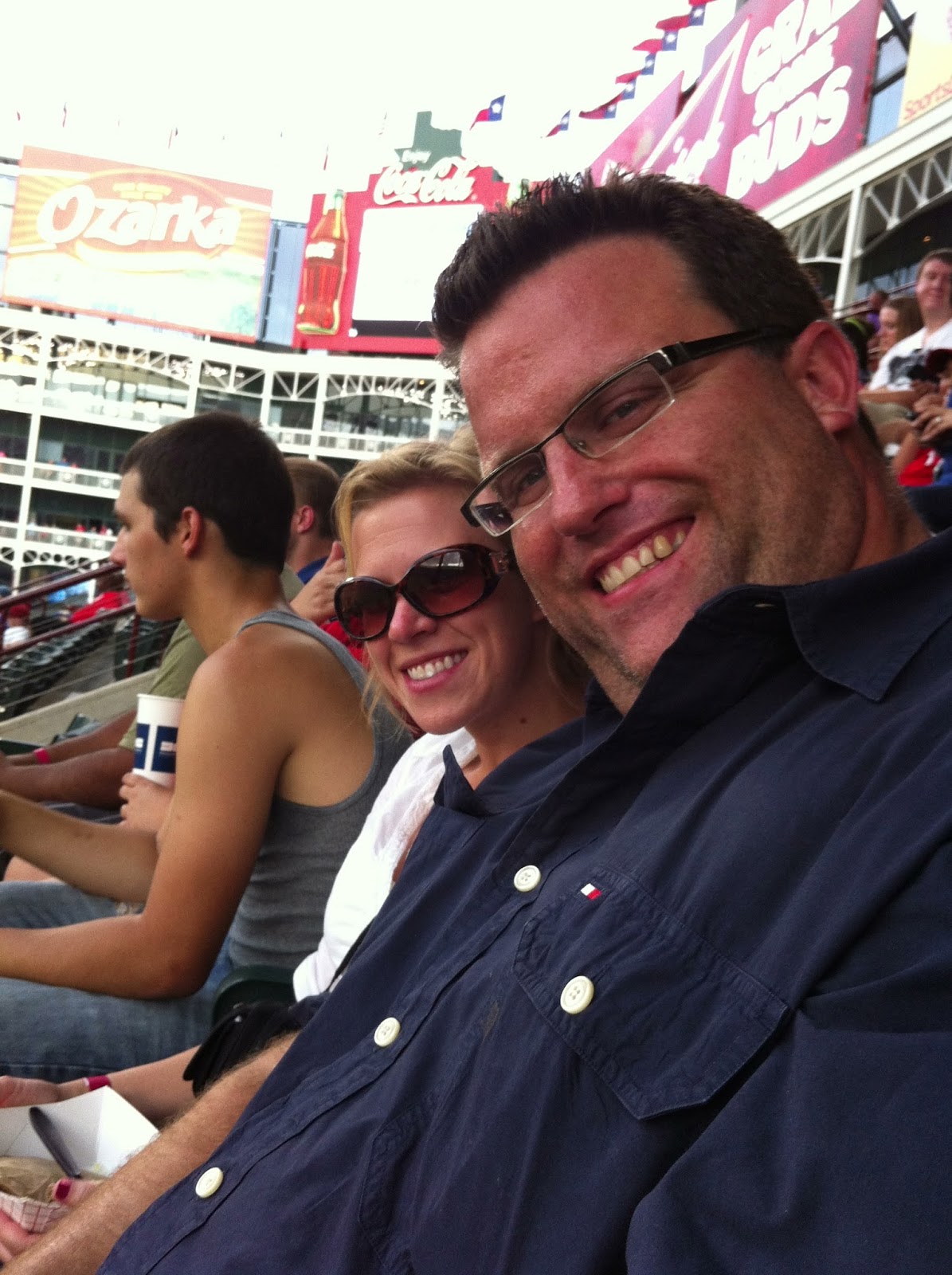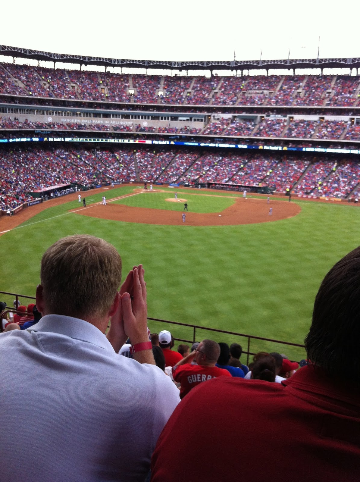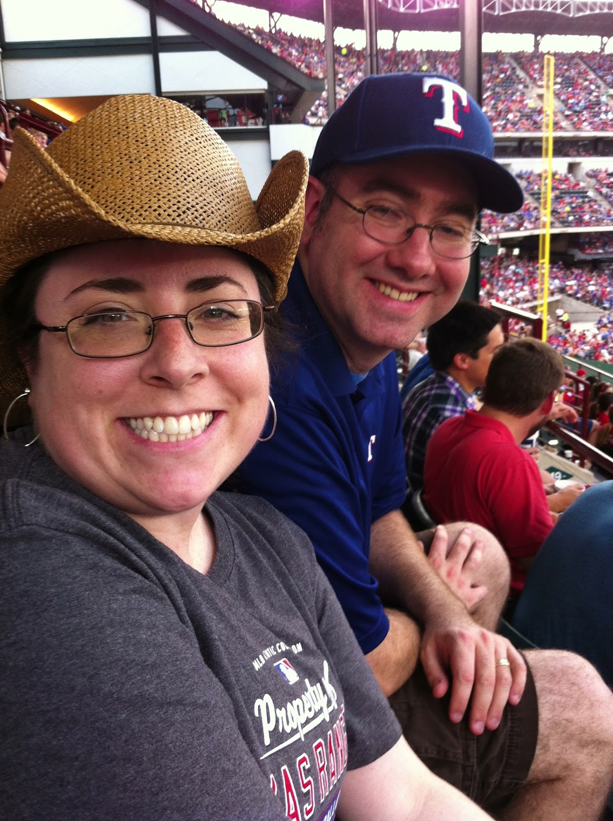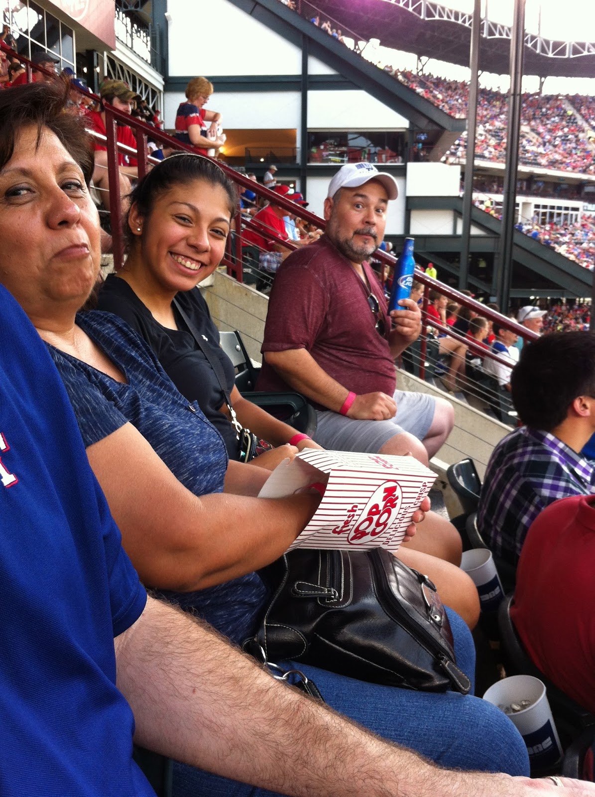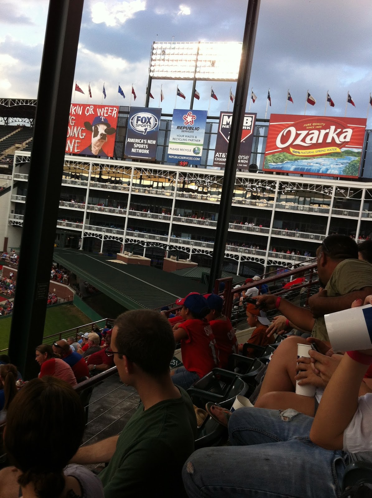 I had a great time at a home Rangers baseball game yesterday with my husband, two close friends who really are like family to me, my aunt and uncle in-laws, and my cousin in-law. We sat in the "All You Can Eat" section in the shade. It was still really hot, but everything else about the game was great. The Rangers swept the Angels by winning the third game of that series - with the third walk-off home-run as well (pretty exciting!). Here are some pictures from the game: