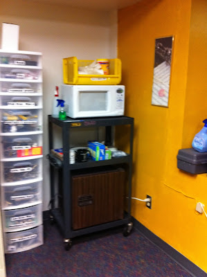 Now, if I had more time (and money), I'd repaint the walls - a deeper golden color with that back wall (where the filing cabinets are) a nice garnet/ruby color (all the way up to the ceiling over that overhang). I'd also get some valances for the six windows in my office. I'd get the desks fixed (handles are falling off and the drawers don't shut easily). I'd also reupholster the office chairs and get a nice rug. As of right now, the color scheme works because of the carpet. The carpet is blue with gold and ruby specks. So the blue trim everywhere, all the gold/yellow stuff (school color), and the ruby chair match.