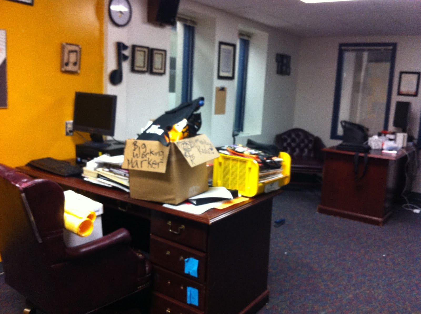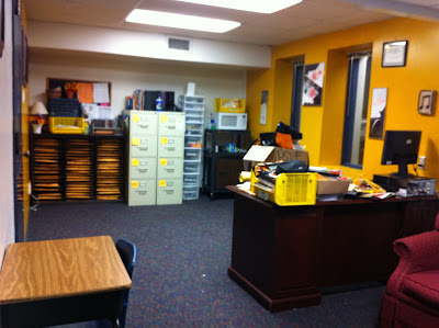 Here's a shot from one of the doors to enter (there is a second entry door - from the practice room hallway). The main door (where I'm standing to take this picture) is from the small rehearsal/instrument storage room at the start of the practice room hallway. I can't get the entire office in one shot. If you could swing to the right, you'd see the swivel recliner chair (for parent conferences) and my desk.