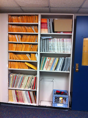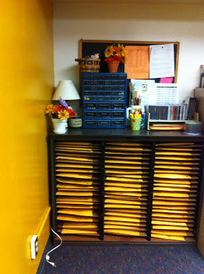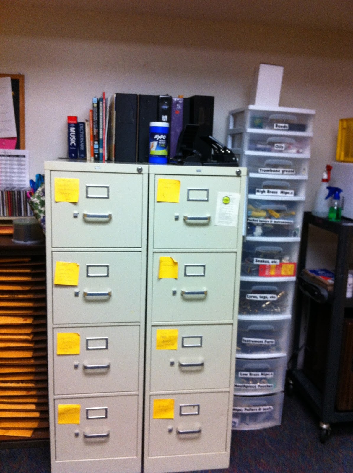 Today was all about organizing my office. While I was out during mid-July, it rained and rained here in north Texas. Well, my office and practice rooms flooded. I didn't know this until I came back to work on Monday. I saw the carpet cleaning machine in the band hall and asked the assistant principal if the custodians were going to steam clean the carpet (I needed to know because Music and Arts was bringing back the summer repairs and would need to lay the cases out on the floor). The assistant principal then told me about the flood and said that the custodians cleaned it all up with the carpet cleaner. He said it had smelled really bad. I'm so thankful he took care of it. In order to get all the water up though, they had to move MUCH of the stuff in my office. So I moved it all back, rehung the pictures and degrees on the walls, and organized organized organized. I threw out so much paper that wasn't needed! I also really found a use for the folio shelving that's in the band office. I really have wanted a regular bookcase, but I'm diggin' this thing now. I used the half-envelopes again and labeled them so I can clearly see what's in them. I tried to keep the music-type stuff on the left (daily drill exercises, scales, etc.), the assessment-type stuff on the right, and other stuff in the middle. I put the toolbox on top (which is STUFFED) with supplies. In fact, I had to put the extra supplies in other places.