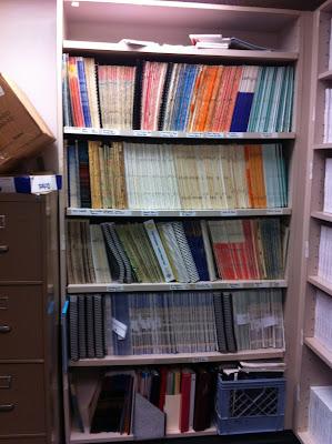 Above are the shelves that have the Pep Band Music and some method books. Below are the shelves that house (from left to right) the Marches, Christmas music, and Popular music. You can see the envelopes of originals to be filed.