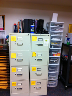 I need to make sure the file cabinet drawers are organized well and then print and laminate labels. I use these file cabinets to store supplies and stuff (I don't have the inner rack to use for hanging file folders). The yellow post-its were supposed to be temporary labels (they remained all last year).