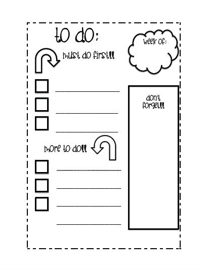 Not the most amazing thing ever, but just thrown together with Word using the provided shapes. And the best part is that it is free! I also created weekly lesson planning pages for each month. Here they are (just click on the link for each month) August, September, October, November, December, January, February, March, April, & May as well as calendar pages. I have the Express Fundraiser calendar book that is awesome, but having the calendar pages I created in one book with my other teacher organization pages will help keep everything centralized. Here they are (again just click on the link for each month to download for free): August, September, October, November, December, January, February, March, April, May, June, & July. I also created a To Do page (see picture & click on link to download for free).