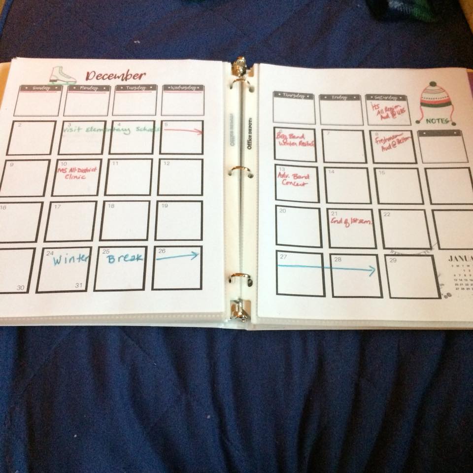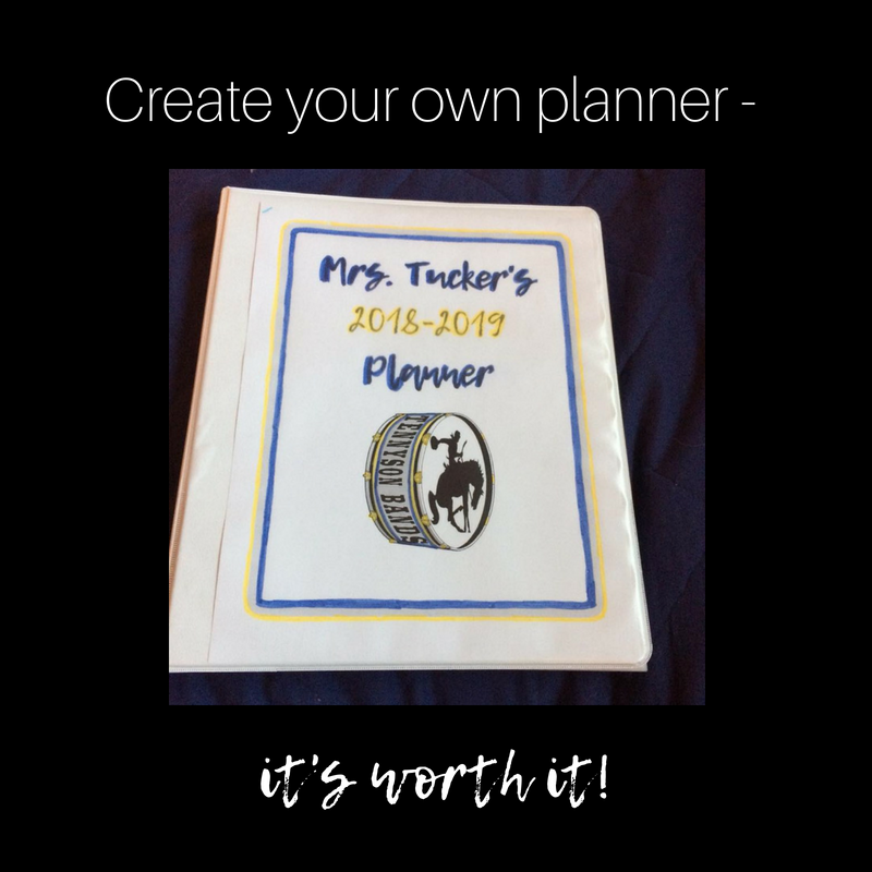 On to how I made my planner... In canva.com, there are different templates for different projects (social media squares, letter size documents and presentations just to name a few). You choose your template and then you can choose pre-designed layouts or design your own using tools such as backgrounds, shapes, lines, grids, text (in many different fonts, sizes and colors), as well as uploading your own images. For the planner, I chose the US Letter template and uploaded the band logo I created for the cover page. I used two fonts - Aileron Thin & Lemon Tuesday - throughout. I utilized some of the elements from the erin condren planner that I liked and found some great quotes that spoke to me. For me, I wanted to have some To-Do pages, blank planning pages, reflection pages, pages to list goals and such as well as the calendar pages. For the calendar pages, I used the shapes tool and made the squares that I copied and pasted throughout the pages. That was the most time-consuming thing. Once I created the first month layout, I just needed to change the numbers in each square as well as the month title and special monthly images. It was somewhat time-consuming, but was a labor of love. I am a paper planner girl. I just operate better when I can physically hold my schedule in my hand and see things all laid out versus having it electronically only. Now mind you, I do have a google calendar that I've shared with the administration and other directors, but this planner is for me.