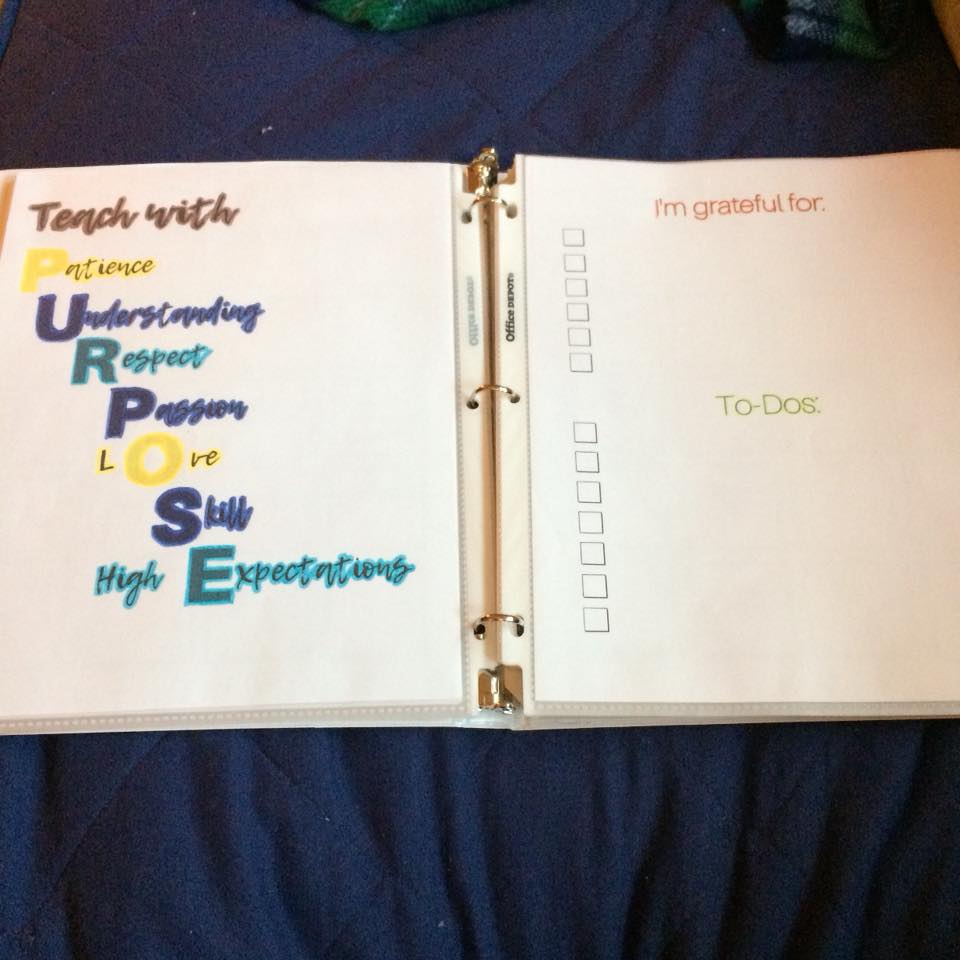 Teach with P(atience) U(nderstanding) R(espect) P(assion) (l)O(ve) S(kill) (high)E(xpectations). It's important to be grateful and make a list of things you are grateful for. And again, to-do lists. :)