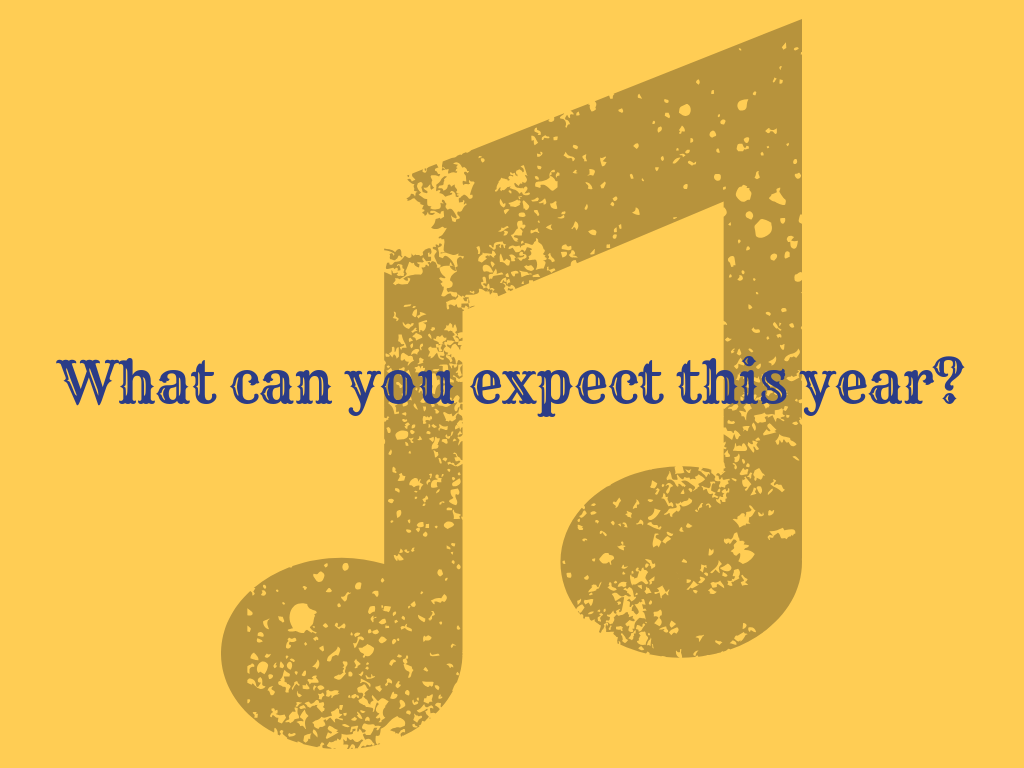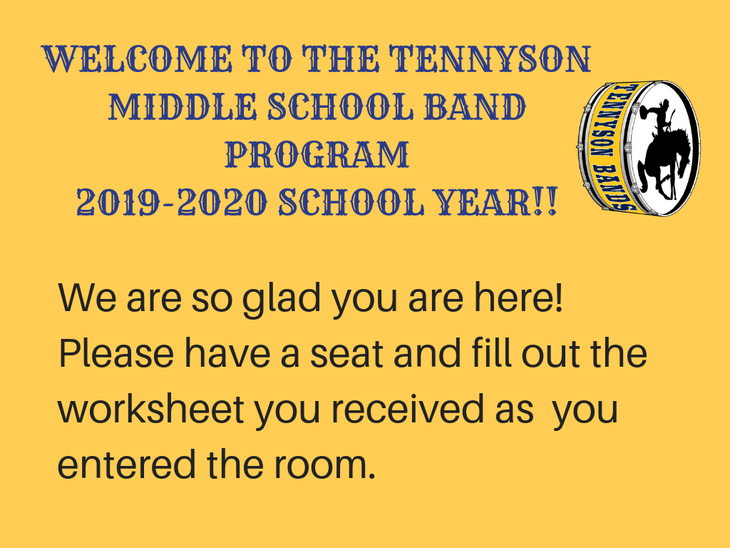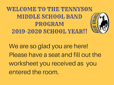 I plan on having the chairs labeled with the students' names. I'll just use address labels and mail merge to print them. I'll seat the beginners alphabetically by class and last name (my class in ABC order, then Mr. Bloch's and then Mr. Lemmons's). I'll seat the Advanced Band kids in chair order in their sections (how they'll sit when we start playing). The two of us remaining directors will help the kids find their chairs. I'll have seating charts already printed out and in my director binder so it'll be pretty easy for me to check attendance. We always check schedules on the first day of school too to make sure the students are in the correct class, so we'll be walking around doing that as well. This slide will be projected as students come in:
